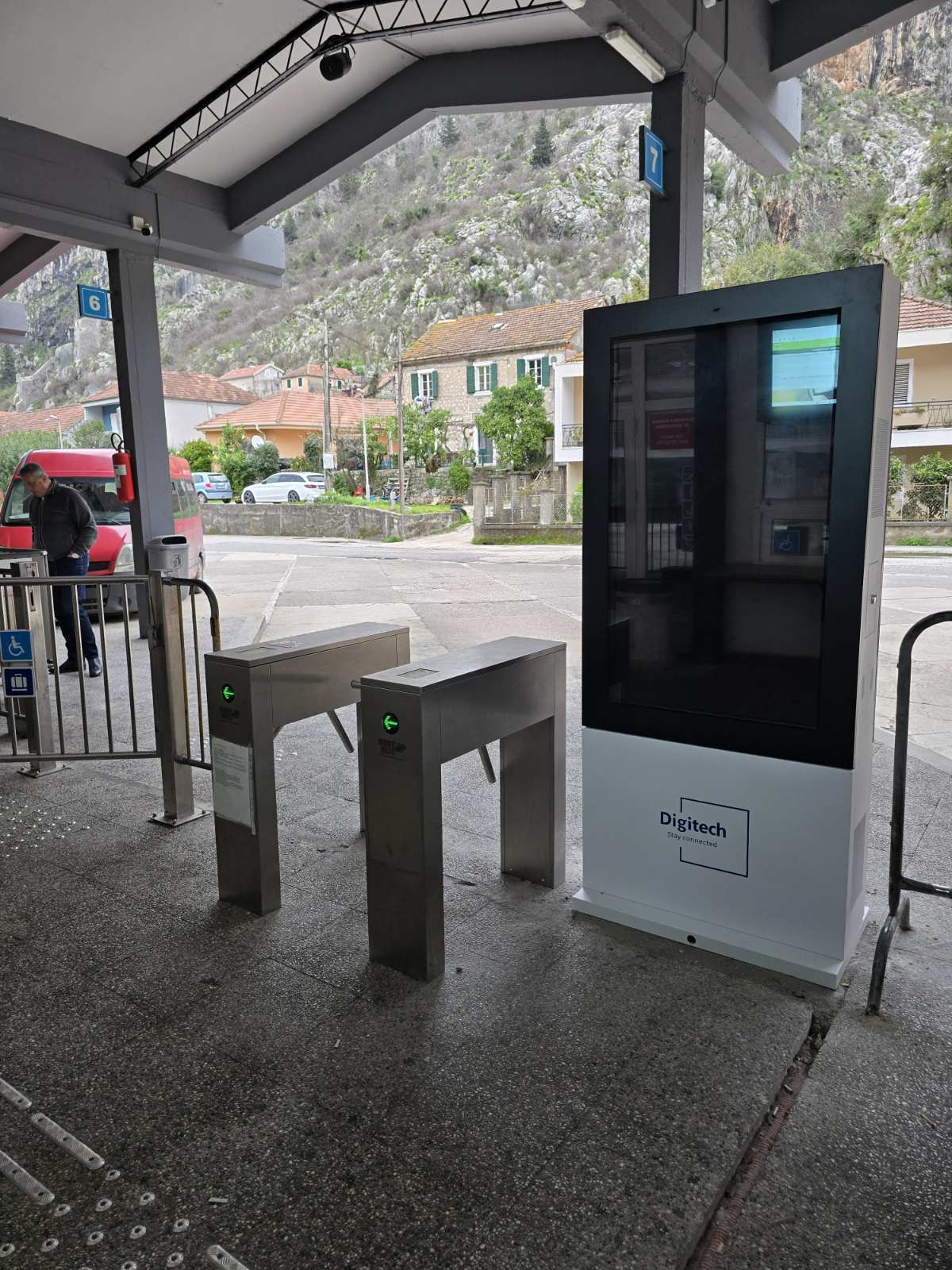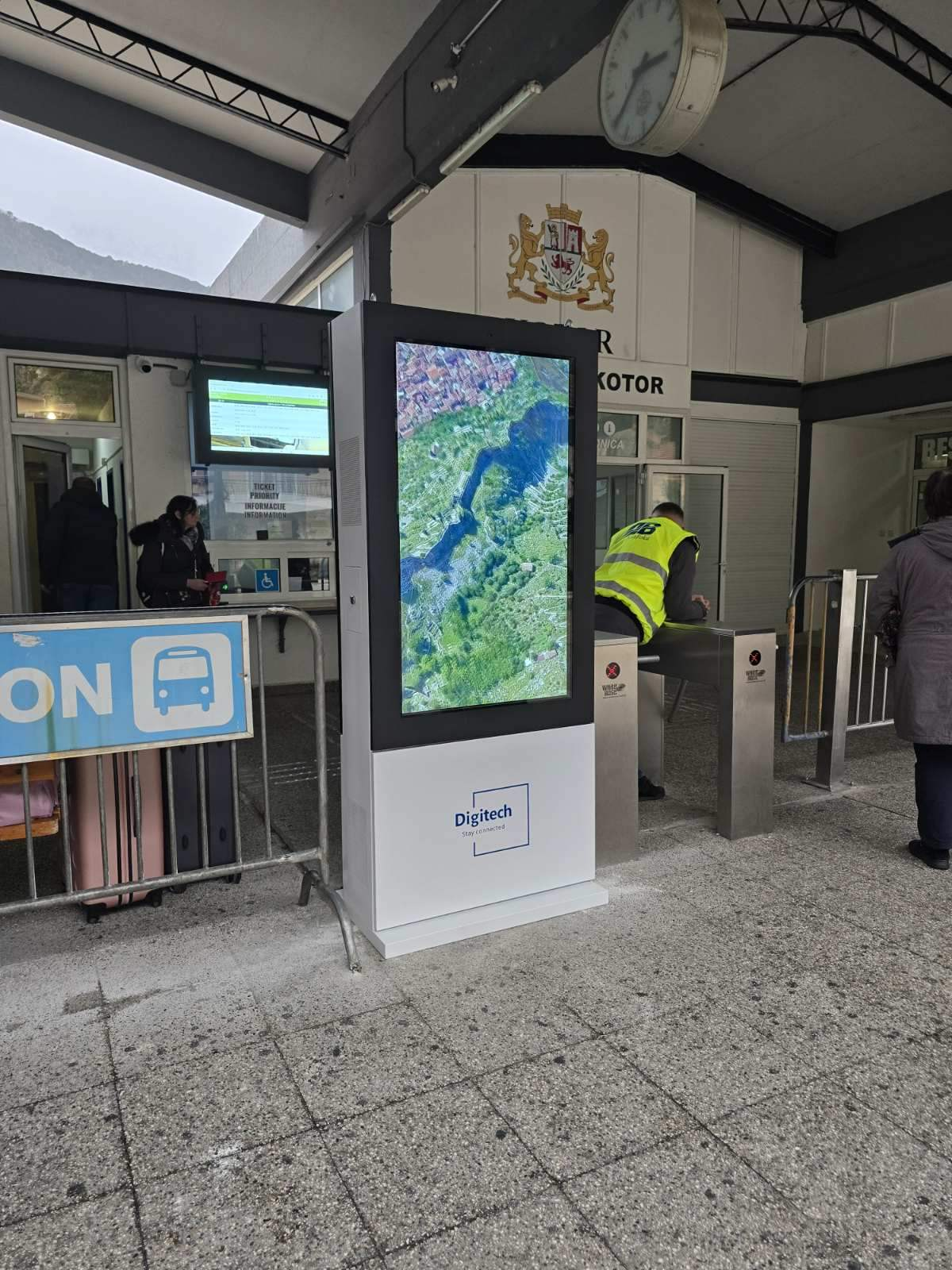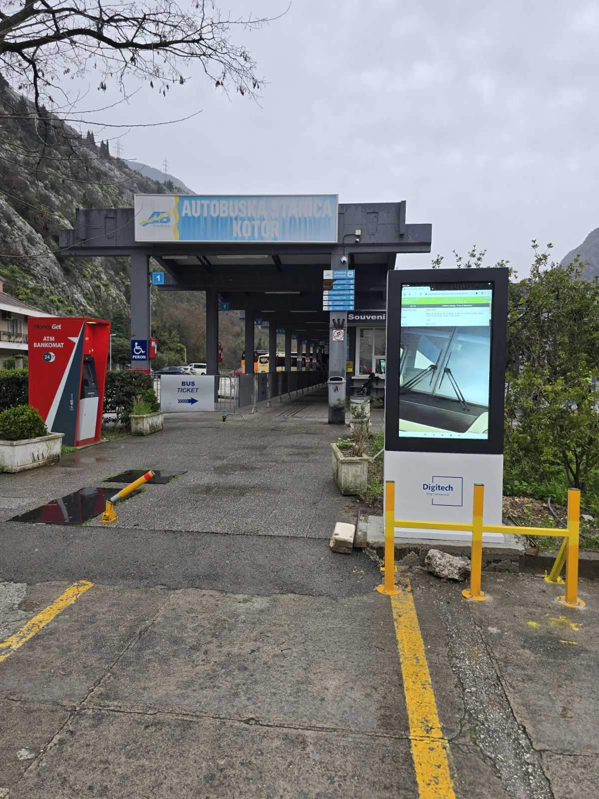 Autobuska stanica Kotor displej 2Reklamni displej sa ekranom od 55” sa obije strane.Instaliran na ulazu u autobusku stanicu sa parking.Putnici koji idu prema peronima ili izlaze sa njih ne mogu a da ne primjete Vašu reklamu..!